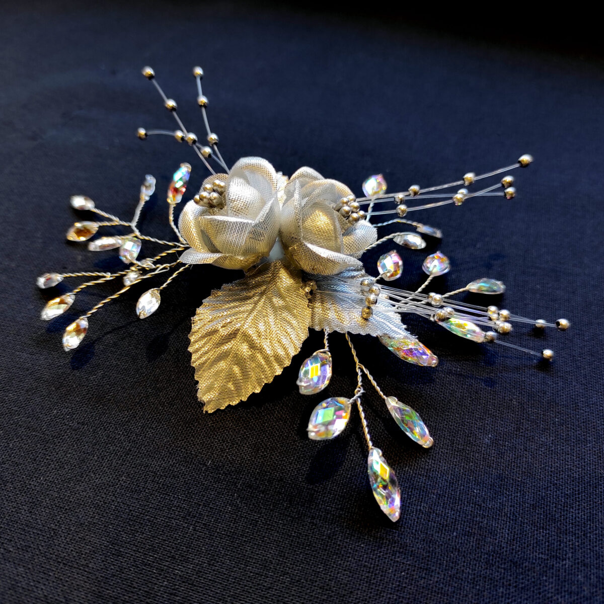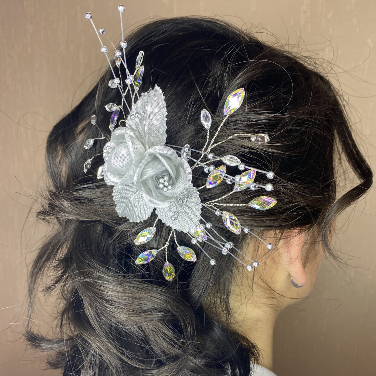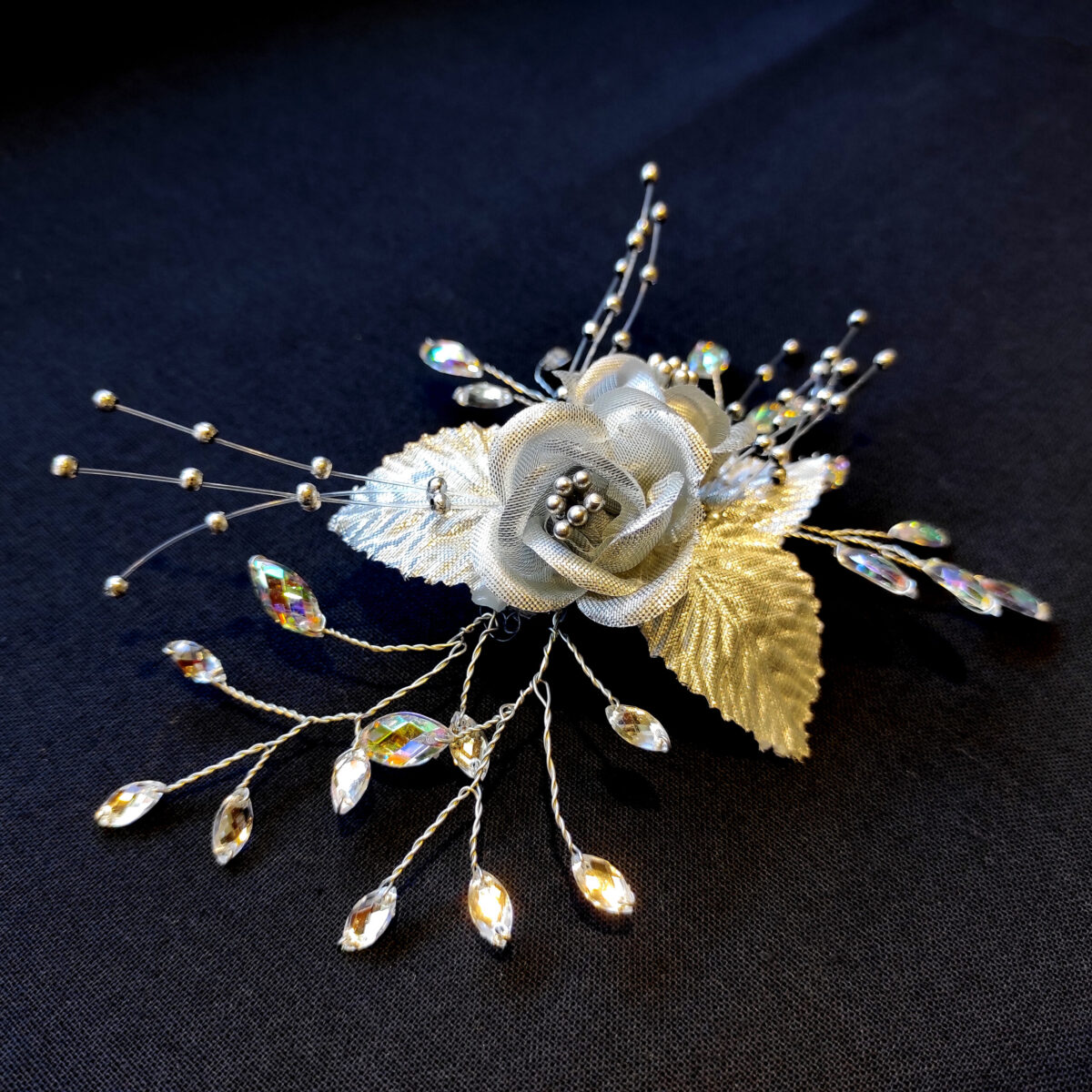 🔸 Descripción: flores de tela plateada con diamantinas y mini perlas platinadas.
