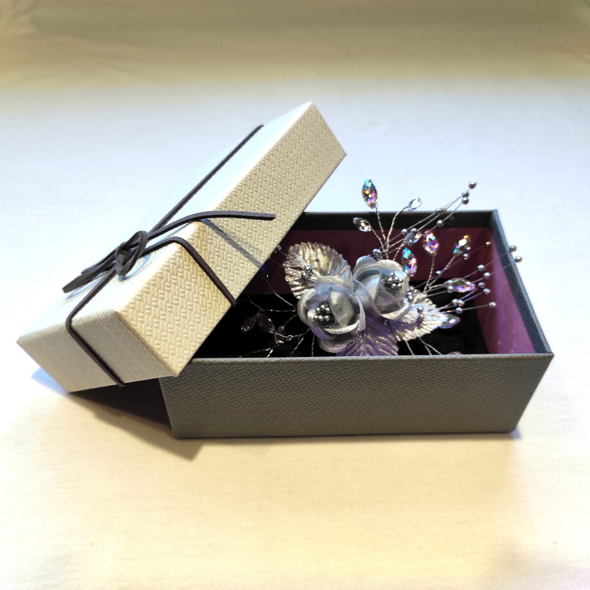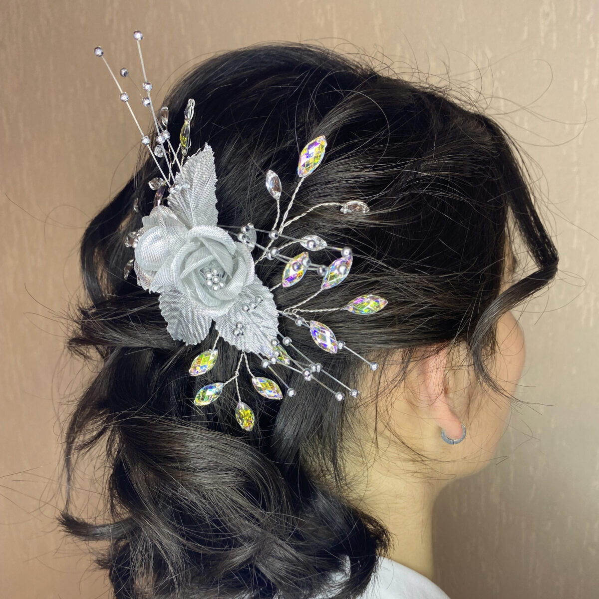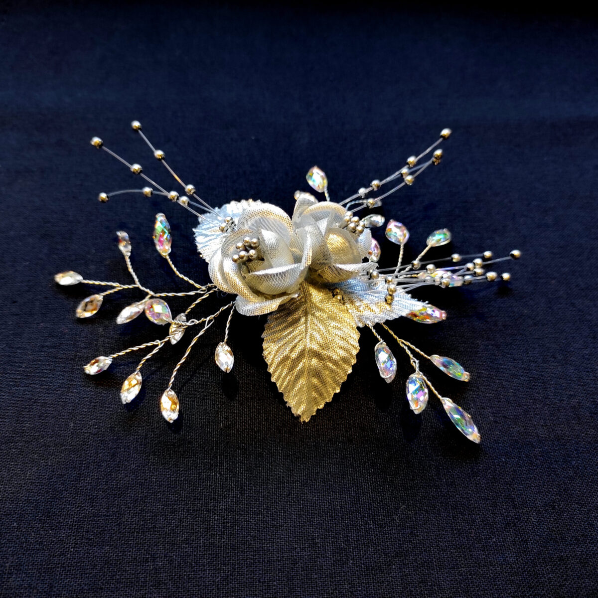 🔸 Descripción: flores de tela plateada con diamantinas y mini perlas platinadas.