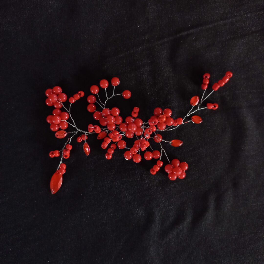 🔸 Arreglo con perlas y mostacillas rojas, de diseño irregular y exclusivo.