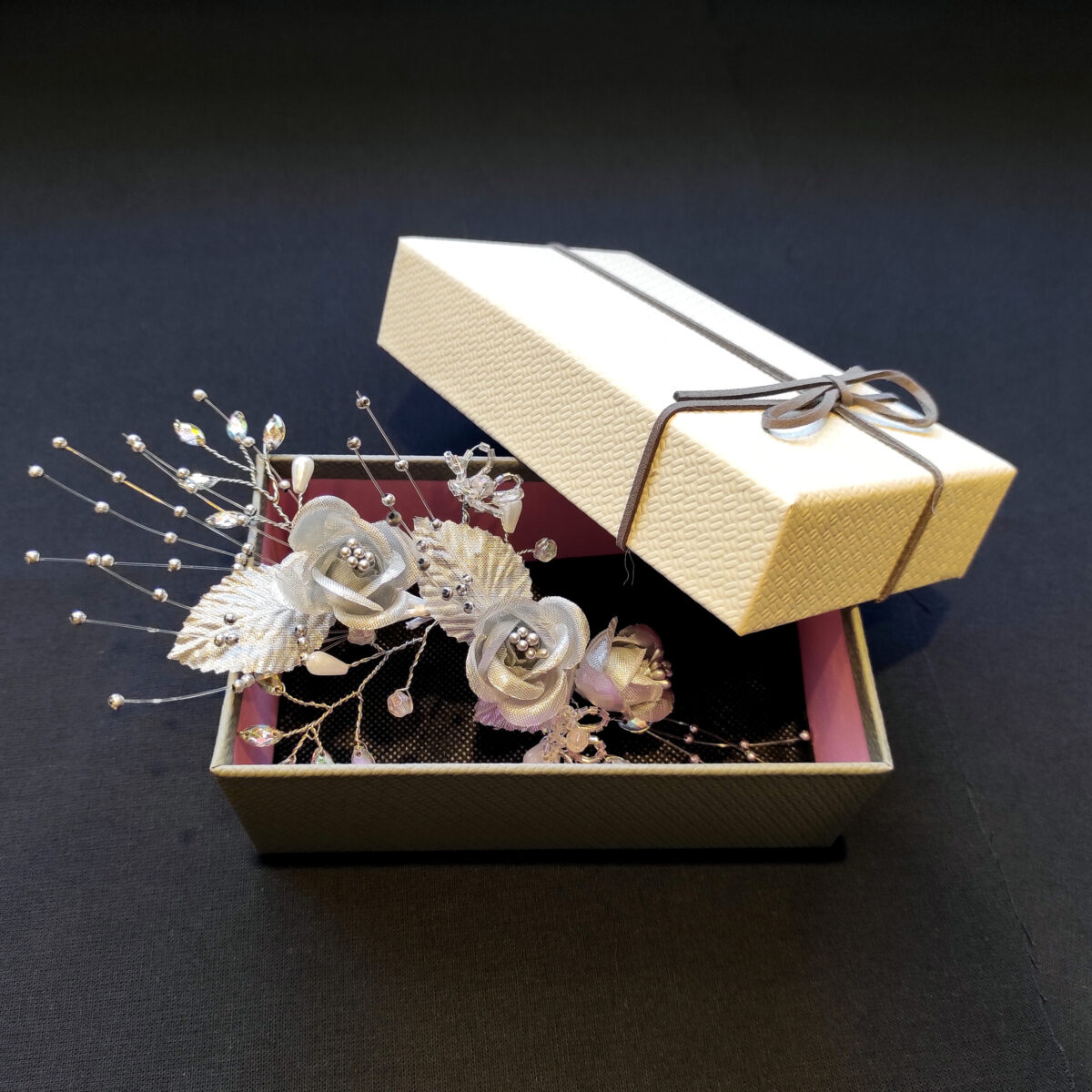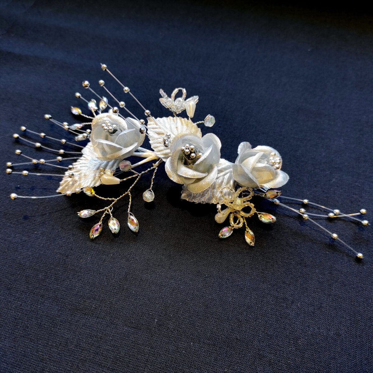 🔸 Descripción: tocado irregular con rosas plateadas de tela, mini perlas y diamantines