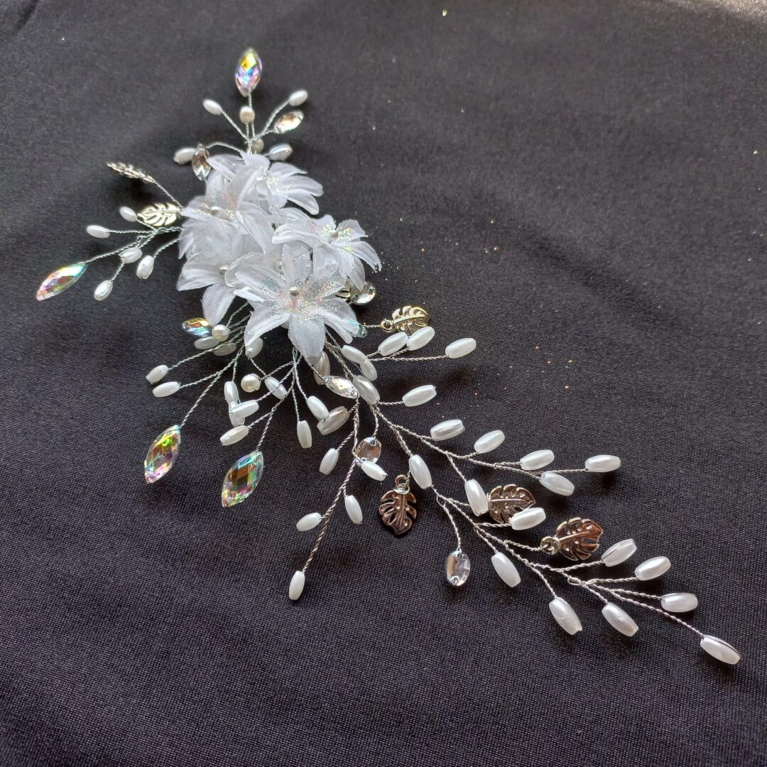 🔸 Ramillete de flores de gaza blanca enmarcadas en guías de perlas arroz y hojas plata.