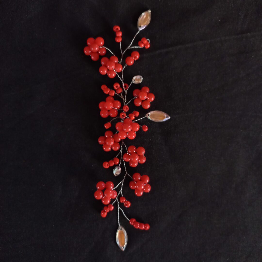 🔸 Media corona para nuca y lateral irregular, de perlas rojas y pequeños brillos.